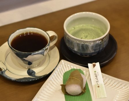 3月10日から提供開始!笠間の老舗、御菓子処松島の和菓子を使った季節の和菓子&本格抹茶&コーヒー3点セットが1000円!!笠間焼での提供です♪