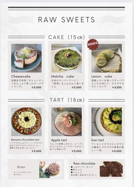 | その他 | アレルギー、ヴィーガン対応のロースイーツや、低糖質・マクロビスイーツのオンラインレッスンも受付中です! |