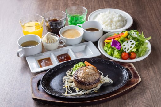 ビーフ100%の肉感たっぷりの自家製ハンバーグと、茨城県産農家直送の新鮮な野菜のサラダバイキングが人気です。ドリンクバーはカレー、スープ付でとってもお得!