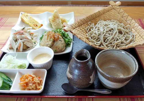香りを楽しめるよう、粗挽きした常陸秋そばを二八で打っています。食べ応えのあるセットメニューもあります。