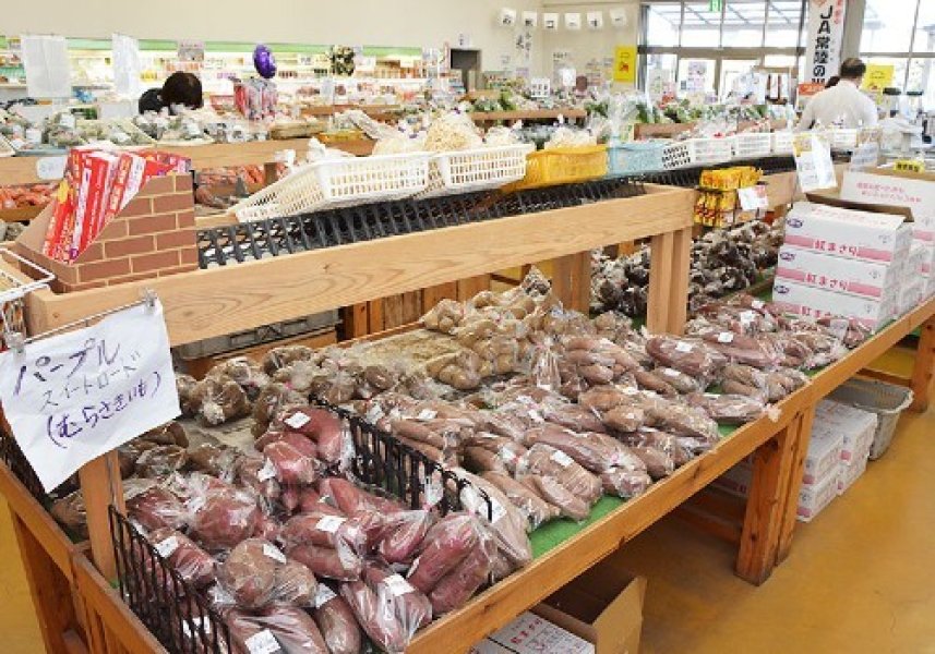 毎日、新鮮な朝採り野菜を中心に四季折々の農産物を取り揃えております。 なかでも、特産品である「ほしいも」、「さつまいも」、つる付いちご「バインベリー」、高糖度トマト、地元産大豆100%使用のオリジナル豆腐、ほしいもから醸造した限定焼酎「にじのなか」・「へのかっぱ」が大人気!!