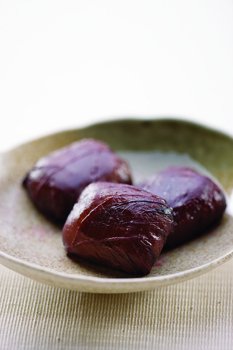 白餡を求肥で包み、蜜漬けのしその葉で