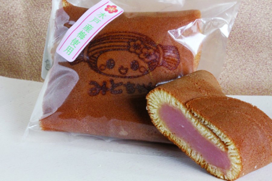 薄いどら焼きの皮の中に、水戸産の梅を白あんにまぜ込んで俵型に。