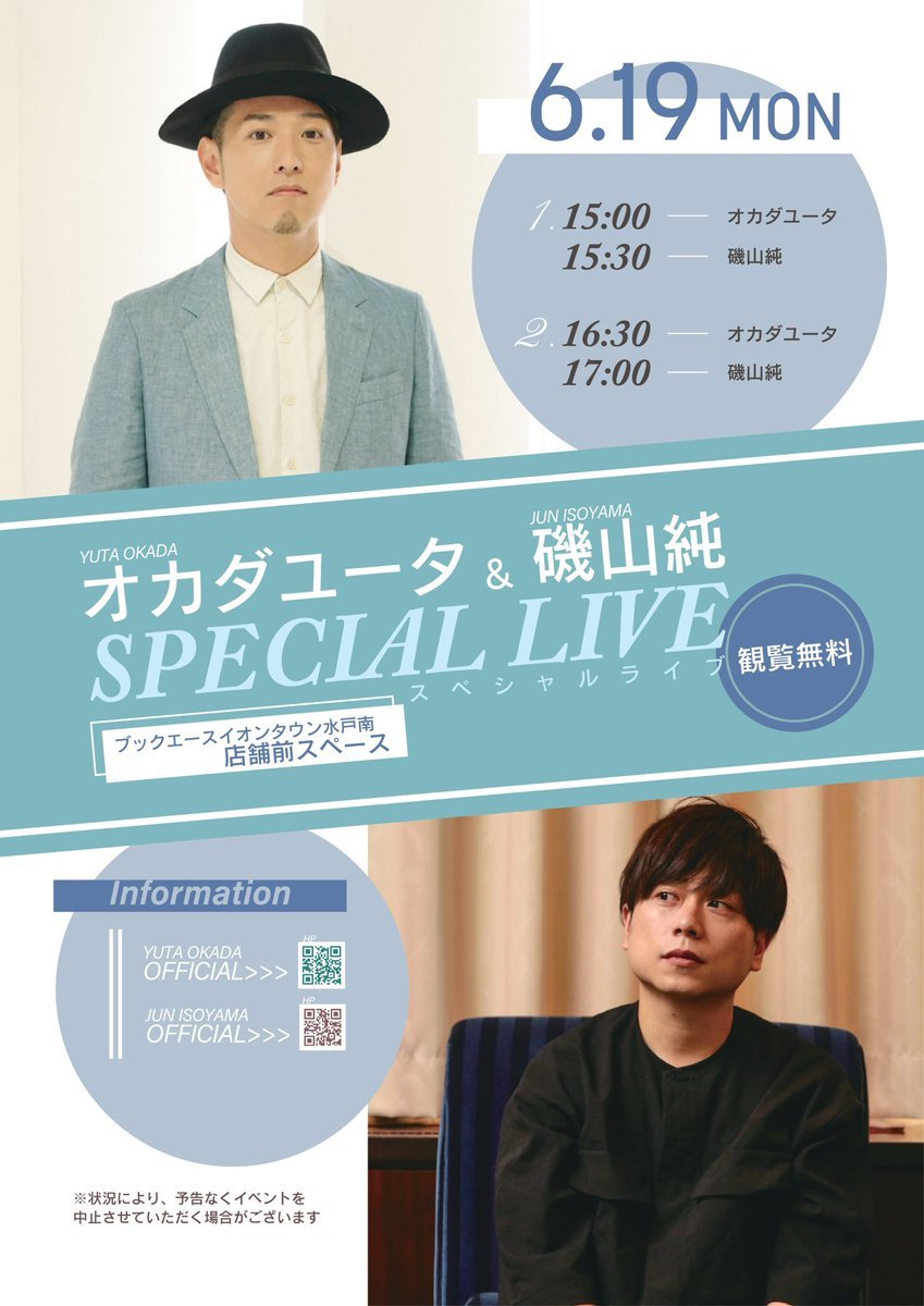 \\🎵スペシャルライブ開催🎵//オカダユータ磯山純スペシャルライブの開催が決定いたしました‼️☞日時◆6/19(月)15:00〜...