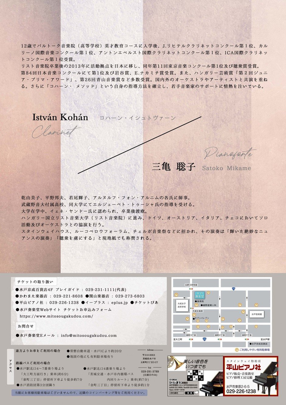 < 出 演 > コハーン・イシュトヴァーン(クラリネット) 三亀聡子(ピアノ) < プログラム > シューマン トロイメライ* 幻想小曲集 Op.73 ブラームス 愛のまこと Op.3-1* 霜が降りて Op.106-3* 調べのように Op.105-1* ハンガリー舞曲集* No.1,No.4,No.5 コハーン 即興演奏 プーランク クラリネットとピアノのためのソナタ ガーシュイン ラプソディ・イン・ブルー* *コハーン編 全席自由 ¥4,500 (前売) ¥5,000 (当日) < 取り扱い > ■水戸京成百貨店 4F プレイガイド Tel : 029-231-1111(代表) ■かわまた楽器店 Tel : 029-221-8608 ■関山楽器店 Tel : 029-273-6803 ■平山ピアノ社 Tel : 029-226-1238 ■イープラス : eplus.jp ■チケットぴあ
