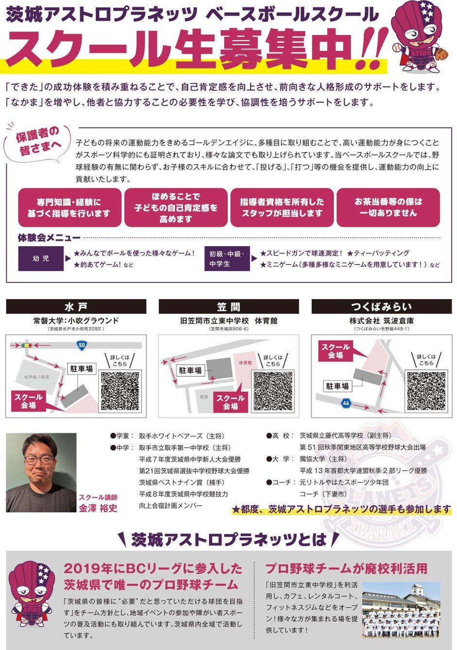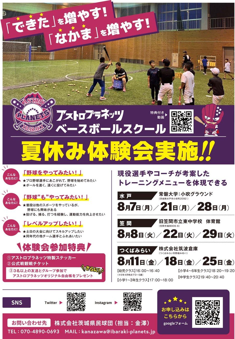| お問い合わせ | 株式会社茨城県民球団(担当:金澤) 070-4890-0693 ※スクール中は電話に出られない場合があります。 MAIL:kanazawa@ibaraki-planets.jp |
