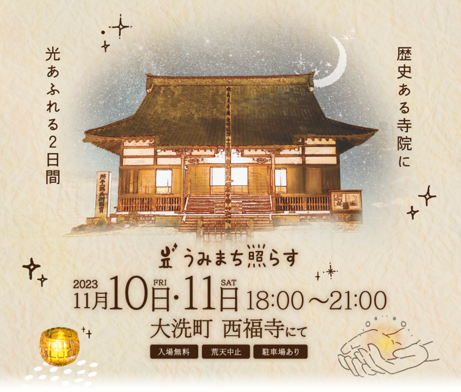 幻想的なひとときを愉しめるライトアップイベント『うみまち照らす』。 今回は商店街の山側に位置し、古くから町の人々の信仰を集めている「西福寺」で行われます。 さらに津軽蛇味線演奏やジャズバンドのLIVEなど、様々なイベントを用意してお待ちしております。 是非この機会に、大洗町の新たな魅力をご体験ください。