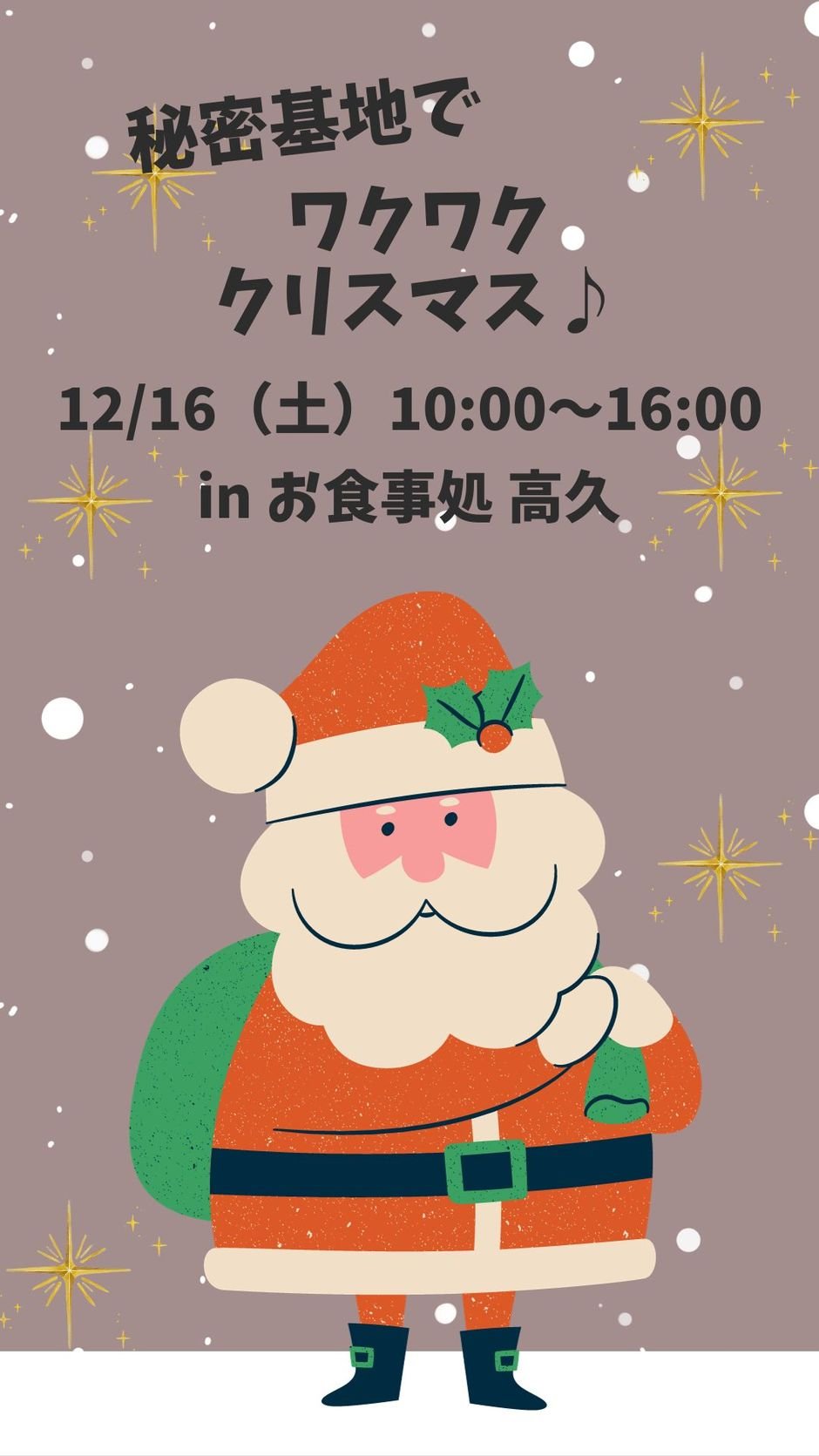 ハロウィンイベントも大好評につき、同じお食事処 高久にて クリスマスイベント開催🎉 クリスマスイベントの企画会も木曜日10:00〜11:00にやっています! ぜひお気軽にお越しください😊 イベント内容予定 ⚫︎クリスマスラリー ⚫︎ワークショップ ⚫︎物販ブース ⚫︎ゴスペル
