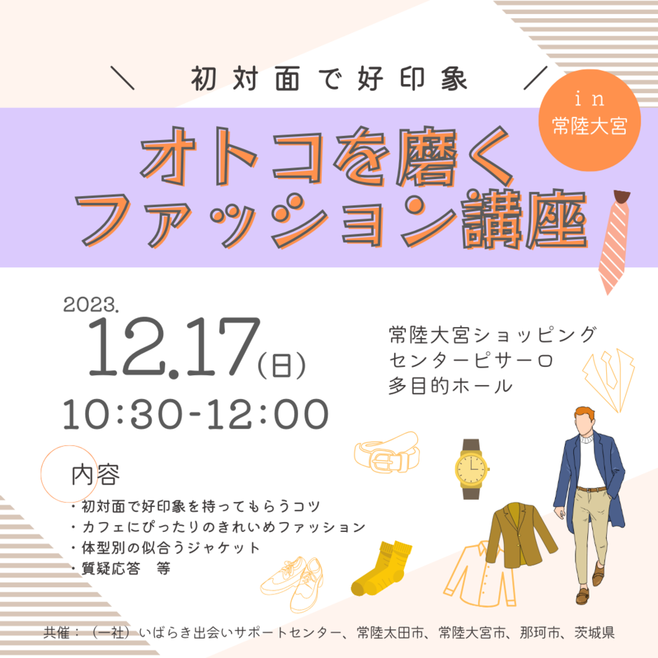/ ありのままを活かしてもっと素敵に! 魅力UPセミナー \ 第一印象で好印象を持ってもらうための、 男性向け・女性向けセミナーを開催します。 男性は「婚活男子向けファッション講座」 女性は「もっと可愛く見えるメイクレッスン」 を学びます。 こんな方におすすめ ・もっと素敵になりたい ・第一印象をよくしたい ・婚活に活かしたい ❰ 女性向けセミナー ❱ ~もっと可愛くなるメイクレッスン~ 13:30~15:00 ふんわり好印象を与える、 自分でもできるメイクの仕方を学びます。 お手持ちのメイク道具をご持参いただき、 眉とアイメイクを中心にレッスンします。 【講師】根本真寿美氏 ・-・-・-・-・-・-・-・-・-・ ❰ 男性向けセミナー ❱ ~婚活男子向けファッション講座~ 15:30~17:00 女性に初対面で好印象を持ってもらうコツ、 女性がチェックするポイントをチェック、 デート向け、体型別似合うジャケットスタイルなどが学べます。 第一印象「アリ」、また会いたいと思ってもらうために。 【講師】 川澄信子氏 ・-・-・-・-・-・-・-・-・-・ ◎日時 2023年11月26日(日) 女性向け 13:30~15:00 男性向け 15:30~17:00 ◎会場 小美玉市四季文化館みの~れ 茨城県小美玉市部室1069番地 ◎対象 20代~40代の独身男女・各15人 ※応募多数の場合抽選 ◎会費 ¥500 ◎受付 女性 13:10~ 男性 15:10~ ◎持ち物 筆記用具、免許証などの写真付き身分証 女性のみ:カガミ、普段お使いのメイク道具(眉・アイメイク用) ◎〆切 11/22(水) ・-・-・-・-・-・-・-・-・-・ 詳細・お申込はこちら https://koi-up3.peatix.com/