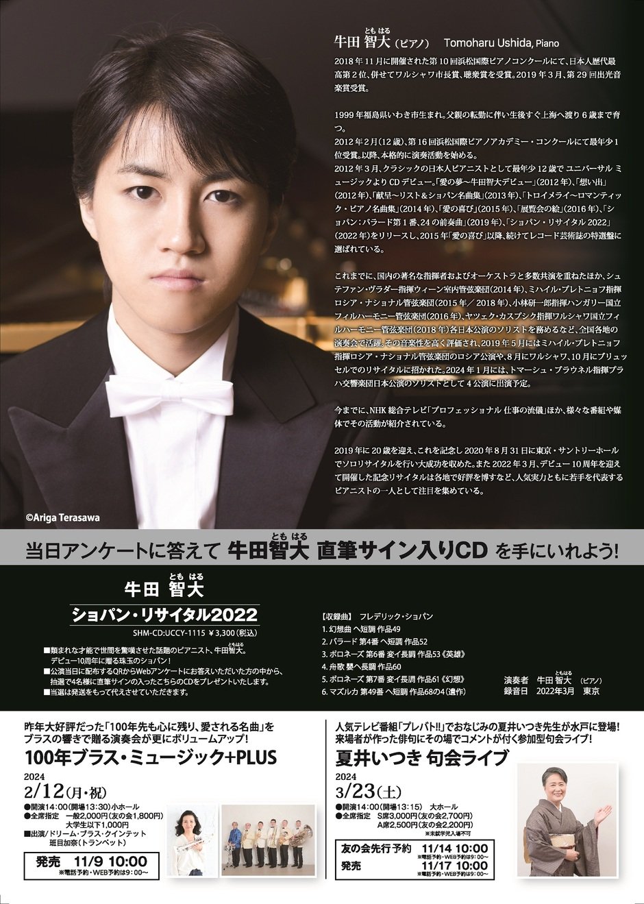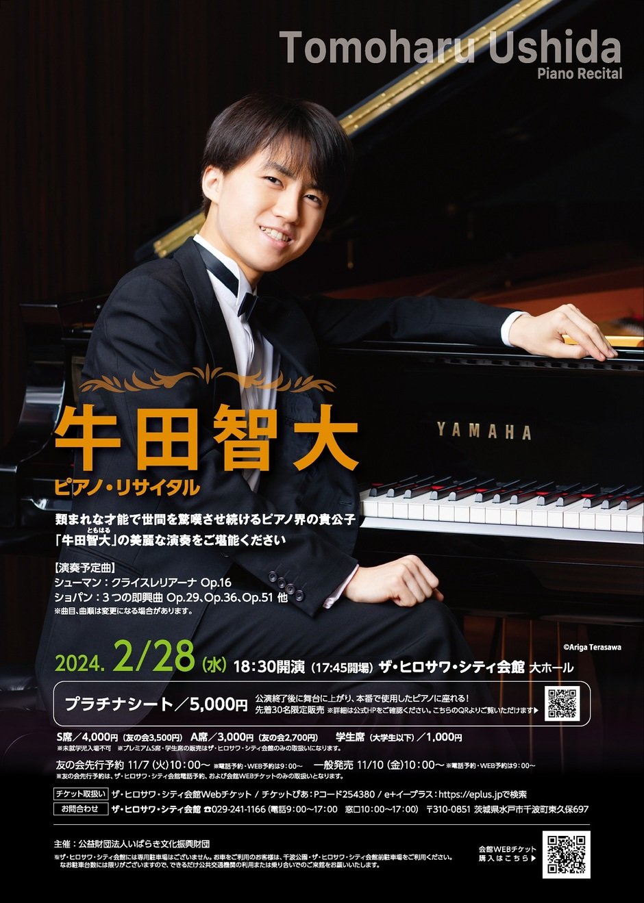 類まれな才能で世間を驚嘆させ続けるピアノ界の貴公子「牛田智大」の美麗なる演奏をご堪能ください。 予定演奏曲 モーツァルト:ピアノ・ソナタ 第4番 変ホ長調 K.282 シューマン:クライスレリアーナ Op.16 (休憩) ショパン:即興曲 第1番 変イ長調 Op.29 ショパン:即興曲 第2番 嬰ヘ長調 Op.36 ショパン:即興曲 第3番 変ト長調 Op.51 ショパン:ピアノ・ソナタ 第3番 ロ短調 Op.58 【申込方法】 チケット購入 ザ・ヒロサワ・シティ会館WEB https://x.gd/k6XBq ザ・ヒロサワ・シティ会館窓口(10:00~17:00) 電話予約029-241-1166(9:00~17:00) 水戸京成百貨店プレイガイド チケットぴあ:Pコード254380 e+イープラス