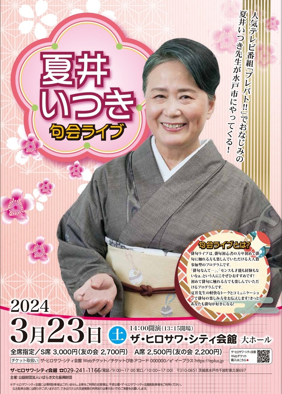 TV番組「プレバト!!」でも大人気の「夏井いつき」先生が水戸に登場! 来場者が作った俳句にもその場でコメントが付く笑って楽しめる参加型句会ライブ! 【チケット購入】 ザ・ヒロサワ・シティ会館WEB https://x.gd/42lZ5 ザ・ヒロサワ・シティ会館窓口(10:00~17:00) 電話予約029-241-1166(9:00~17:00) チケットぴあ:Pコード652083 e+イープラス