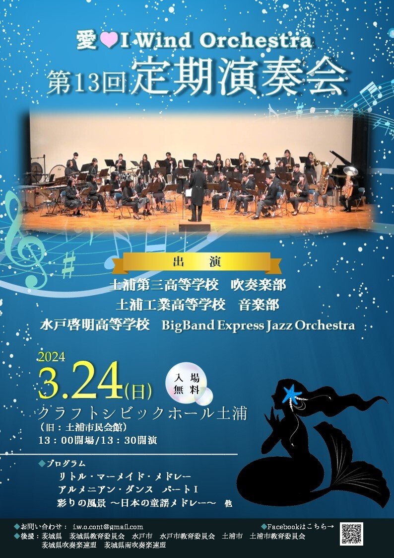 愛♡I Wind Orchestraは茨城県南地域を中心に活動している一般市民吹奏楽団です。今回、第13回定期演奏会を行います! 誰もが聞いたことのあるディズニーのあの曲から童謡をモチーフにした曲、更には吹奏楽の名曲まで!子供から大人まで、きっとお気に入りの一曲が見つかるはず♪ また、毎年恒例となっている茨城県内の高校生との合同演奏企画も設けています。今年は、 〇土浦第三高校 吹奏楽部 〇土浦工業高校 音楽部 〇水戸啓明高校 BigBandExpressJazzOrchestra のみなさまが参加予定です!高校生の元気いっぱいな演奏をぜひお楽しみください。 入場は無料です。みなさまのご来場を心よりお待ちしております♪