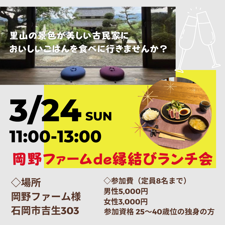定員:8名まで ※25~40歳位の独身の方 ※多数のお申込みの際は途中で〆切となる場合があります |