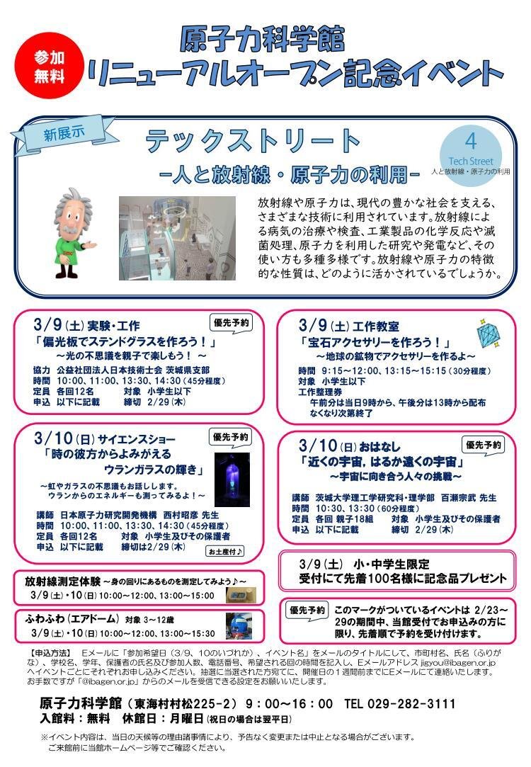 新展示公開記念! 「原子力科学館リニューアルオープン記念イベント」を開催します。 ●新展示「テックストリート ー人と放射線・原子力の利用-」 放射線や原子力が用いられている技術やシーンを再現した4つのブースの中で様々な体験をしてみよう! ●3/9(土)実験・工作 「偏光板でステンドグラスを作ろう!」~光の不思議を親子で楽しもう! ~ ●3/9(土)工作教室 「宝石アクセサリーを作ろう!」 ~地球の鉱物でアクセサリーを作るよ~ ●3/10(日)サイエンスショー 「時の彼方からよみがえるウランガラスの輝き ~虹やガラスの不思議もお話しします。ウランからのエネルギーも測ってみるよ!~ ●3/10(日)おはなし 「近くの宇宙,はるか遠くの宇宙」~宇宙に向き合う人々の挑戦~ ●3/9(土)・10(日)放射線測定体験 ~身の回りにあるものを測定してみよう ●3/9(土)・10(日)ふわふわ(エアドーム) *各催し物時間・定員・申込方法等はホームページをご確認下さい。