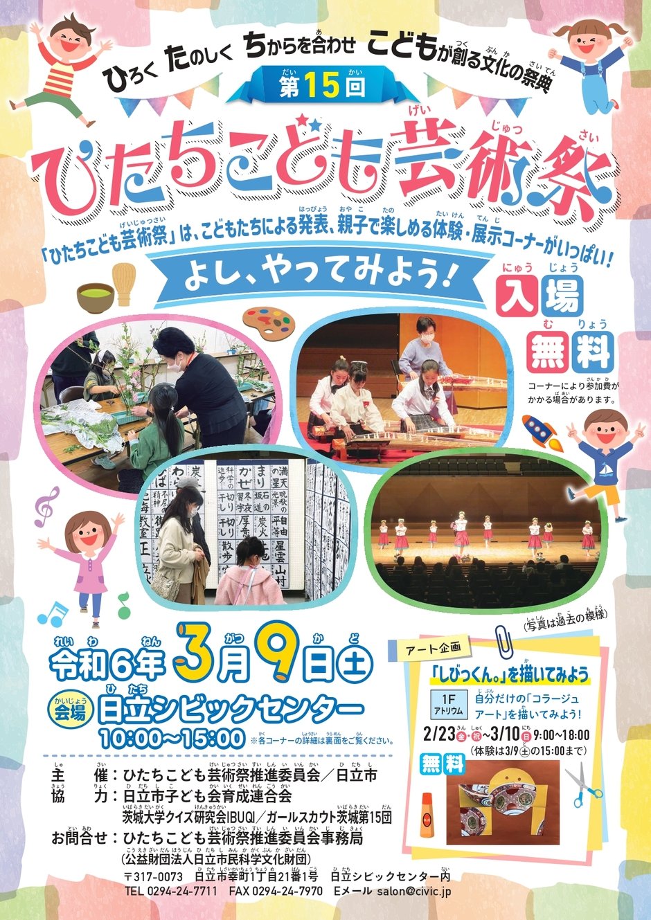 日立シビックセンターにて「ひたちこども芸術祭」を開催します。 日立市内で文化活動に取り組む21の団体が、音楽ホールのステージやギャラリーで日頃の活動の成果を披露する、子どもたちによる子どもたちのための文化の祭典です。 さらに、本番までの約3週間、アート企画『「しびっくん。」を描いてみよう』を実施します。 日立シビックセンターに来場した子どもたちに、オリジナルキャラクター「しびっくん。」をコラージュアートで描いてもらう企画で、描かれた力作は3/10(日)まで展示されます。(600点見込み) ■ひたちこども芸術祭 3/9(土) 10:00~15:00 ■【アート企画】「しびっくん。」を描いてみよう 2/23(金・祝)~3/9(土) 9:00~18:00 ※作品は随時展示(3/10(日)まで) 場所:日立シビックセンターギャラリー、音楽ホール、アトリウムほか 詳細は関連サイトをご覧ください。
