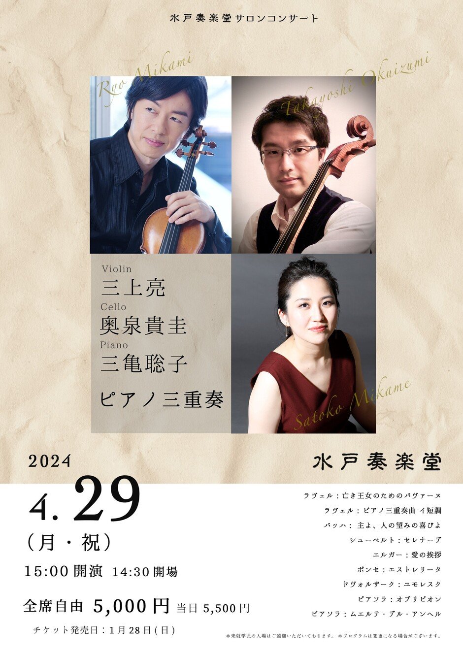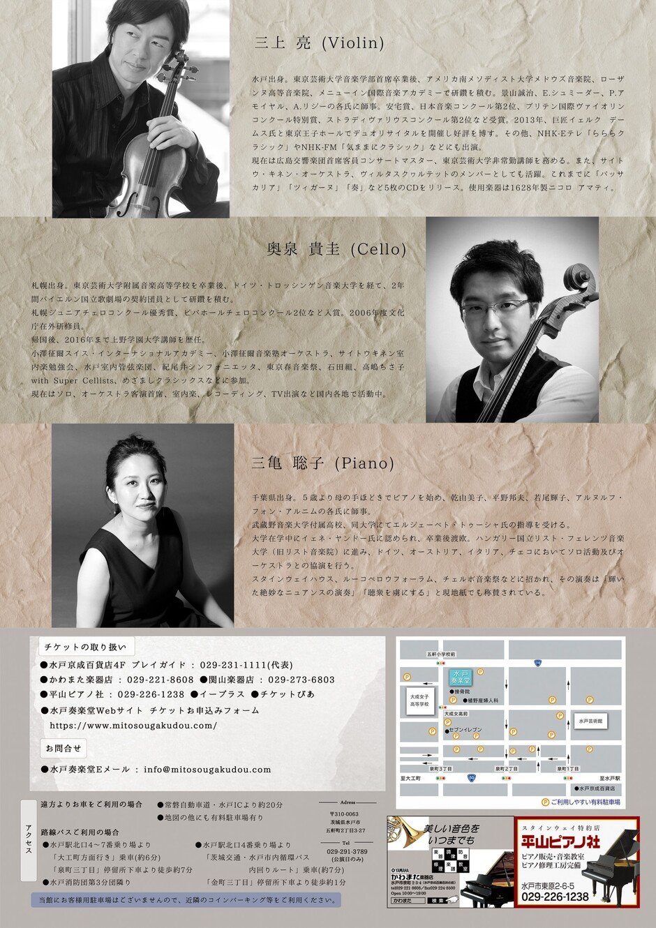 水戸市出身のヴァイオリニスト三上亮、ドイツ在住のピアニスト三亀聡子らによるピアノ三重奏。 チケットは水戸奏楽堂ホームページより、また水戸京成百貨店、かわまた楽器店、平山ピアノ社、関山楽器、チケットぴあ、イープラスでお求めになれます。