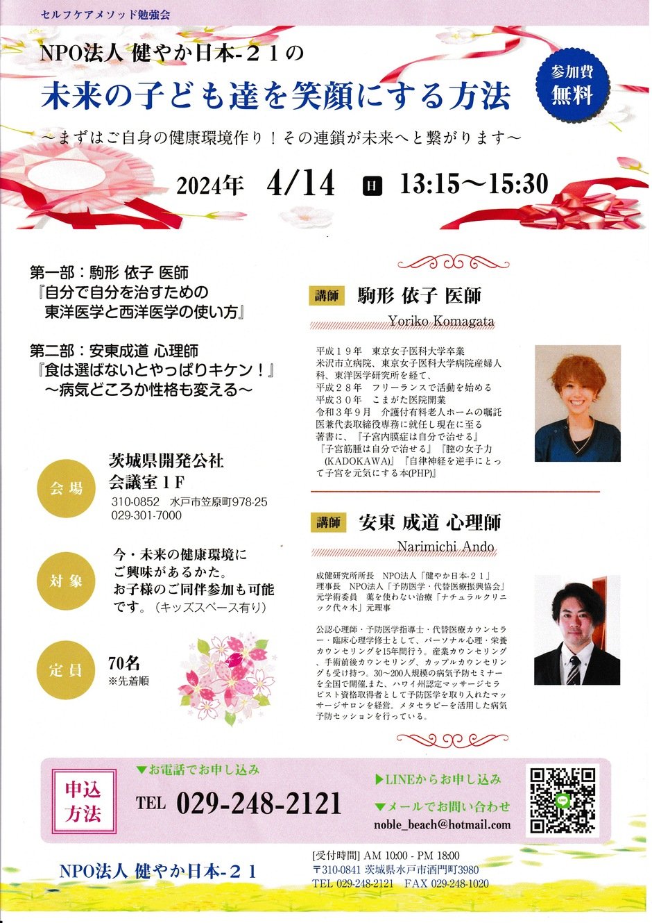 第1部 駒形依子医師『自分で自分を治すための東洋医学と西洋医学の使い方』 第2部 安東成道心理師『食は選ばないとやっぱりキケン!』〜病気どころか性格も変える〜 主催:NPO法人 健やか日本-21 お申し込みは、メールか電話にてお願いします。