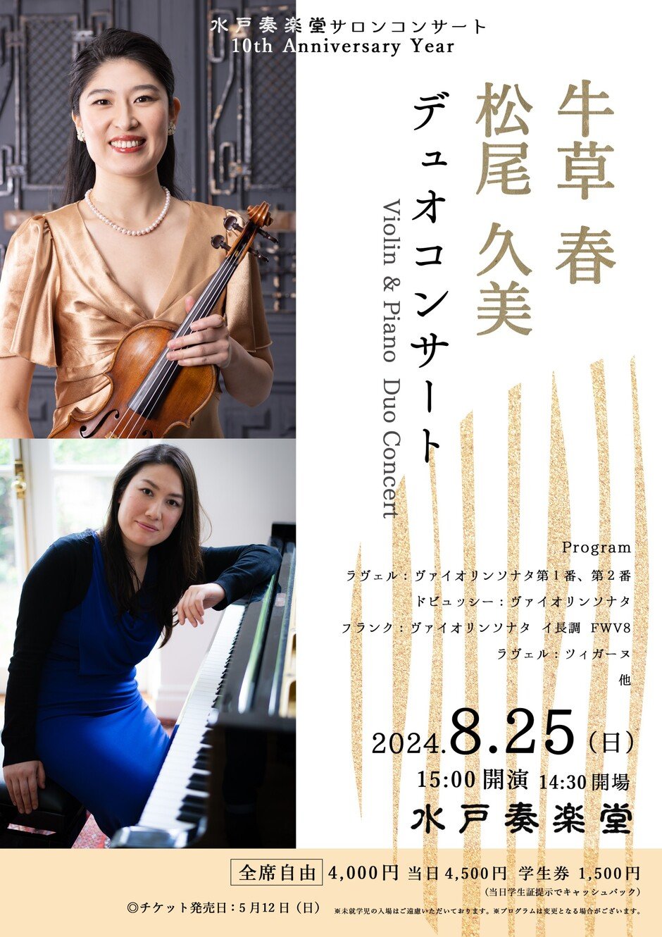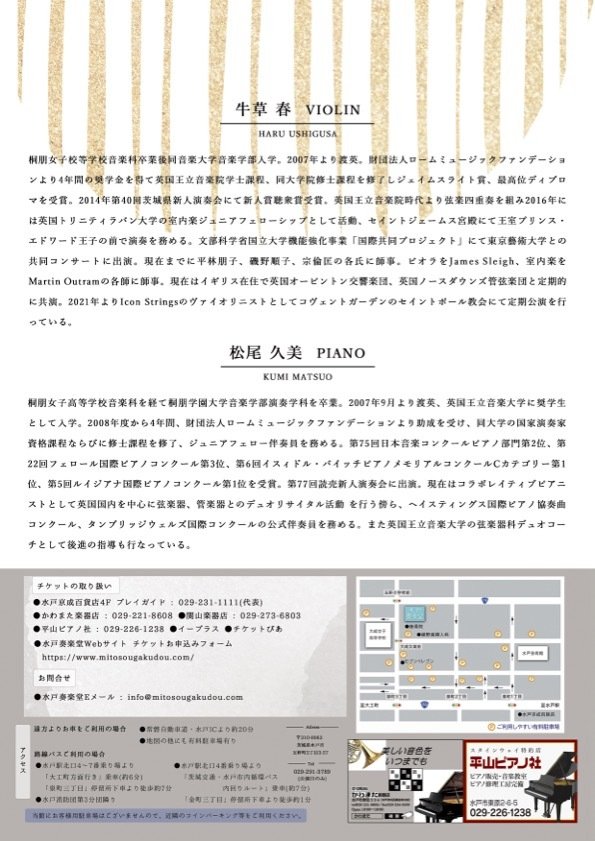 茨城県常陸太田市出身のヴァイオリニスト牛草春と、共にイギリス在住のピアニスト松尾久美による、デュオコンサート。 チケットは当館ホームページ(https://www.mitosougakudou.com/)より、また水戸京成百貨店、かわまた楽器店、平山ピアノ社、関山楽器、チケットぴあ、イープラスでお求めになれます。
