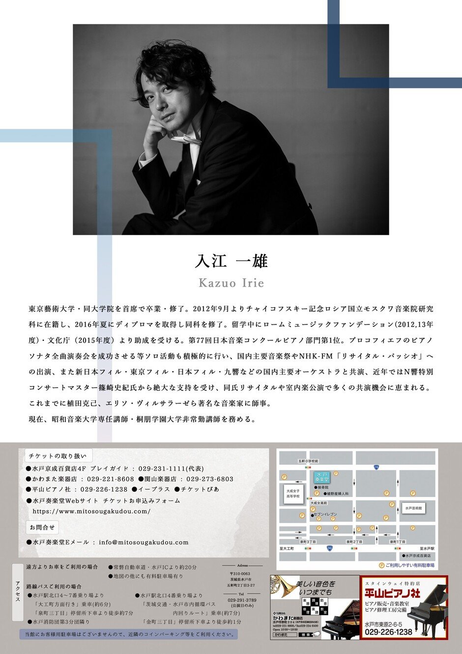 日本音楽コンクールで1位を獲得、国内主要オーケストラと共演など、第一線で活躍中の入江一雄のピアノリサイタル。 チケットは当館ホームページ(https://www.mitosougakudou.com/)より、また水戸京成百貨店、かわまた楽器店、平山ピアノ社、関山楽器、チケットぴあ、イープラスでお求めになれます。