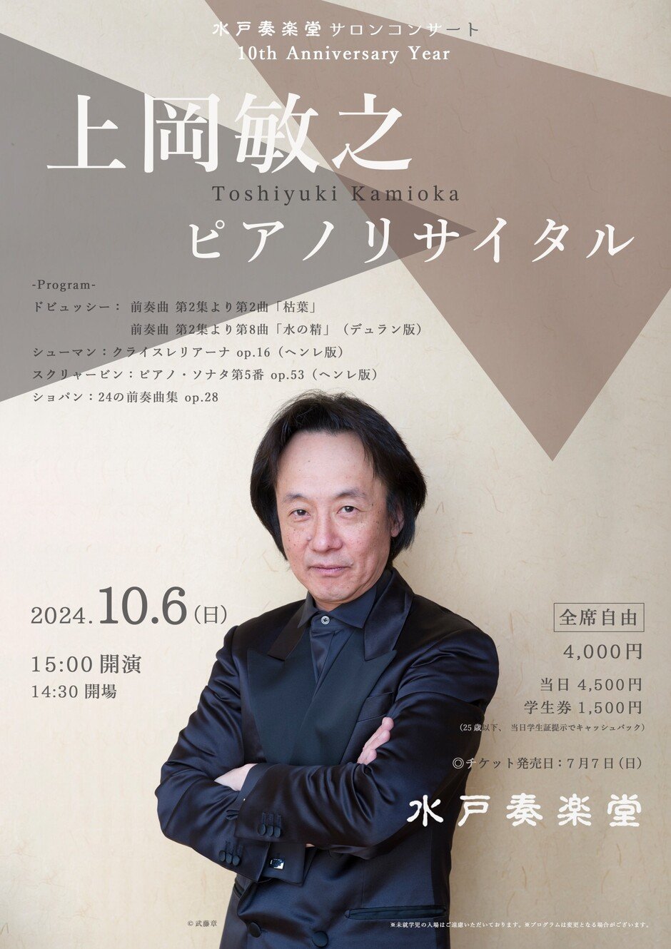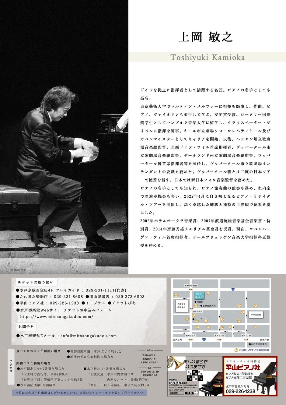 ドイツを拠点に指揮者として活躍する名匠、ピアニストとしても高名な上岡敏之によるピアノリサイタル。 チケットは当館ホームページ(https://www.mitosougakudou.com/)より、また水戸京成百貨店、かわまた楽器店、平山ピアノ社、関山楽器、チケットぴあ、イープラスでお求めになれます。