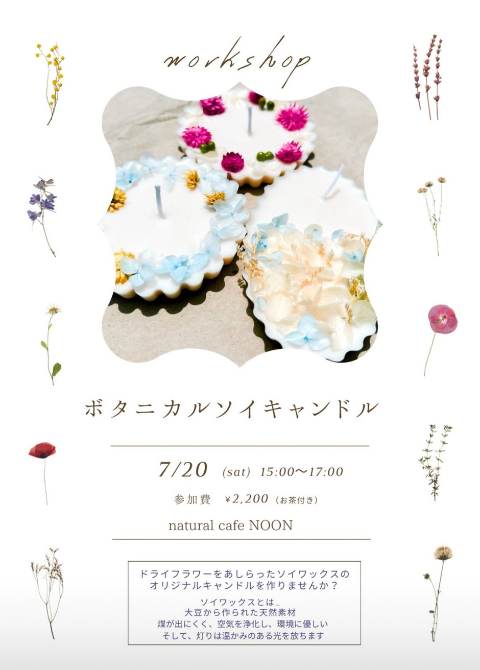 ドライフラワーをあしらったソイワックスの オリジナルキャンドルを作りませんか? 場所は自然派カフェ・NOONにて。 ワンドリンク付きで¥2.200- 参加希望の方は お電話お待ちしております。 ☎️029-297-3003