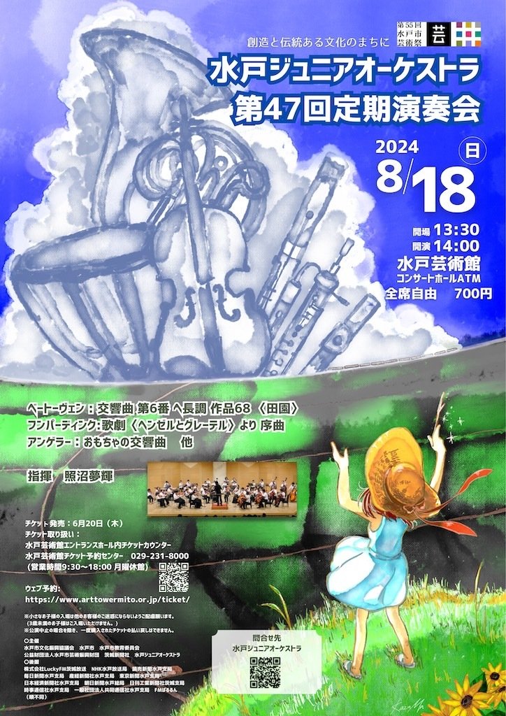 水戸ジュニアオーケストラは昭和52年設立。年に1回の定期演奏会は今回が47回目。昨年より当団OBである日本フィルハーモニー交響楽団クラリネット奏者の照沼夢輝氏を指揮者に迎え、今年はベートーヴェン作曲交響曲第6番「田園」をメインに、初級者クラスも一緒に「おもちゃの交響曲」など、楽しいプログラムとなっています。 水戸芸術館の素敵なホールで、子供たちが精一杯演奏を披露いたします。是非ご来場いただき、週1回練習を重ねてきた団員の演奏をお聴きください。 チケットは水戸芸術館で販売、700円です。