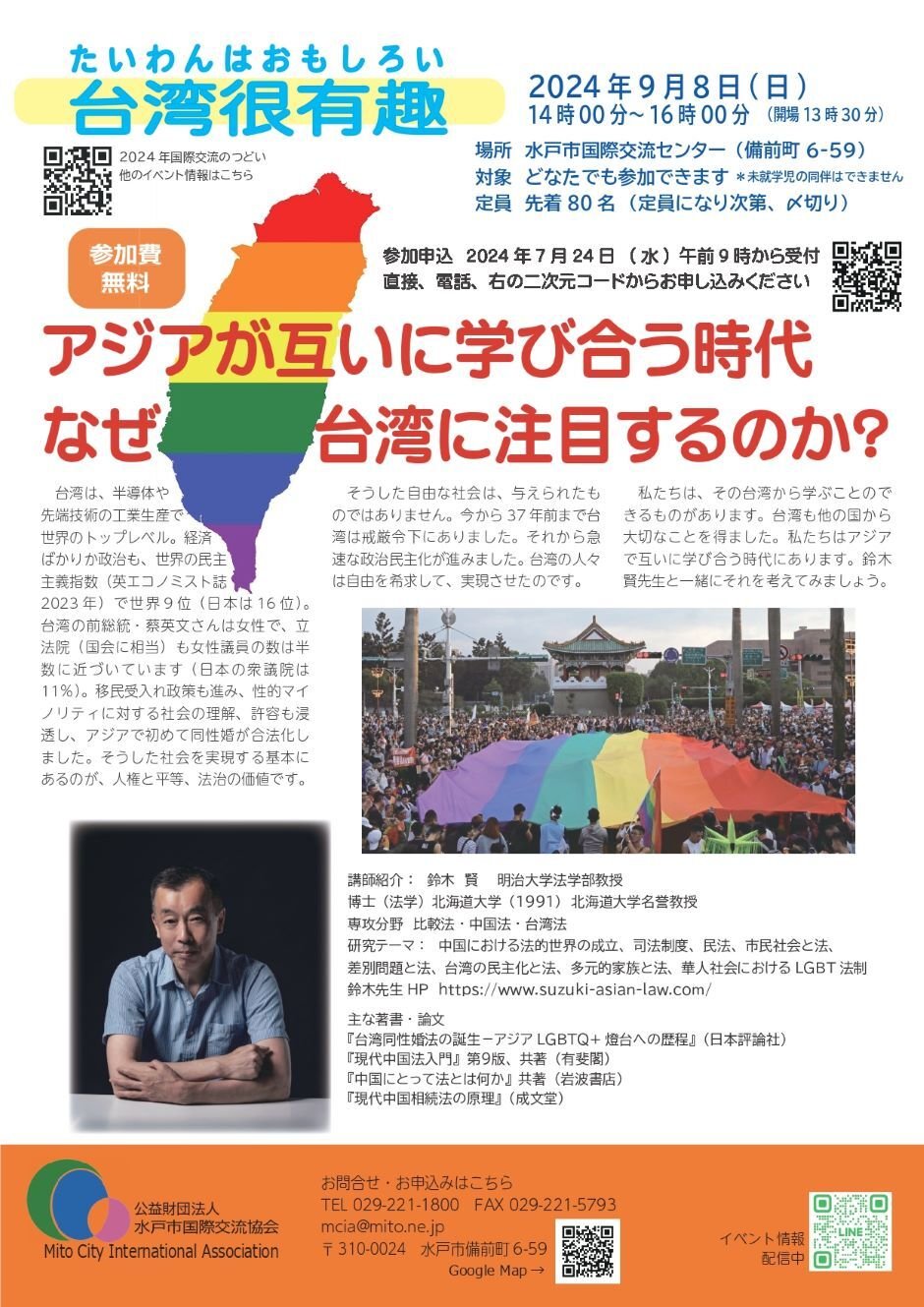 台湾の、人権や自由、平等を重視した社会変革の取り組みやその現状について理解を深めるとともに、私たちはそこから何を学ぶことができるかを、考えるセミナーです。 ===台湾很有趣 (たいわんはおもしろい)!!=== この夏、水戸市国際交流センターでは、水戸市と台南市(台湾)との友好交流にちなんで台湾をご紹介する多彩なイベントを開催します。