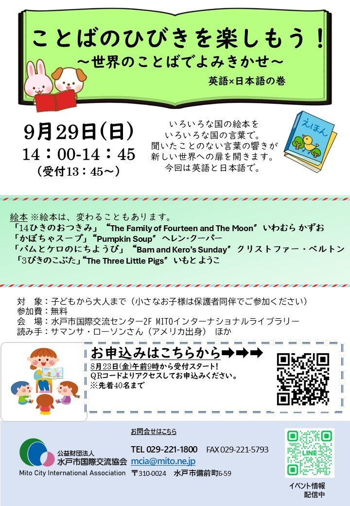 | お問い合わせ | 主催:(公財)水戸市国際交流協会 MAIL:mcia@mito.ne.jp TEL:029-221-1800 FAX:029-221-5793 |
