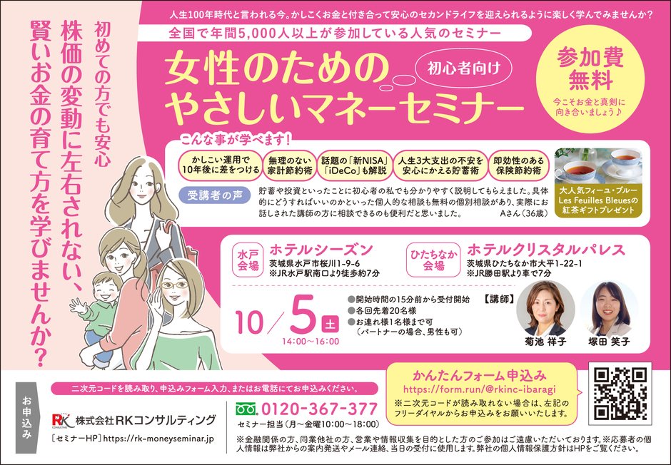 全国で年間5000人以上が参加している人気のマネーセミナーが、10月に水戸市とひたちなか市で開催されます。
