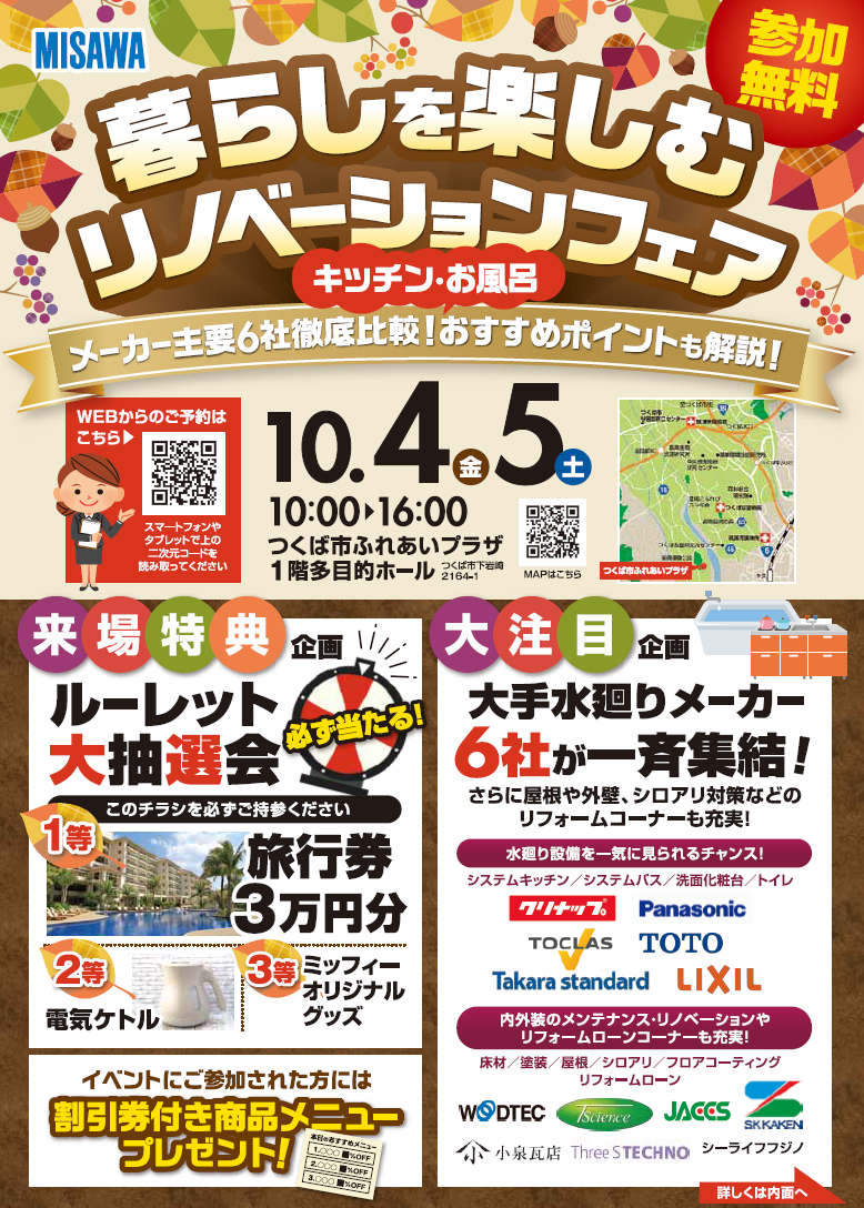 大手水廻りメーカーが6社集うのはここだけ。屋根や外壁、シロアリ特集リフォームコーナーも充実。参加は無料。ご家族おそろいで、ぜひお気軽にお越しください!