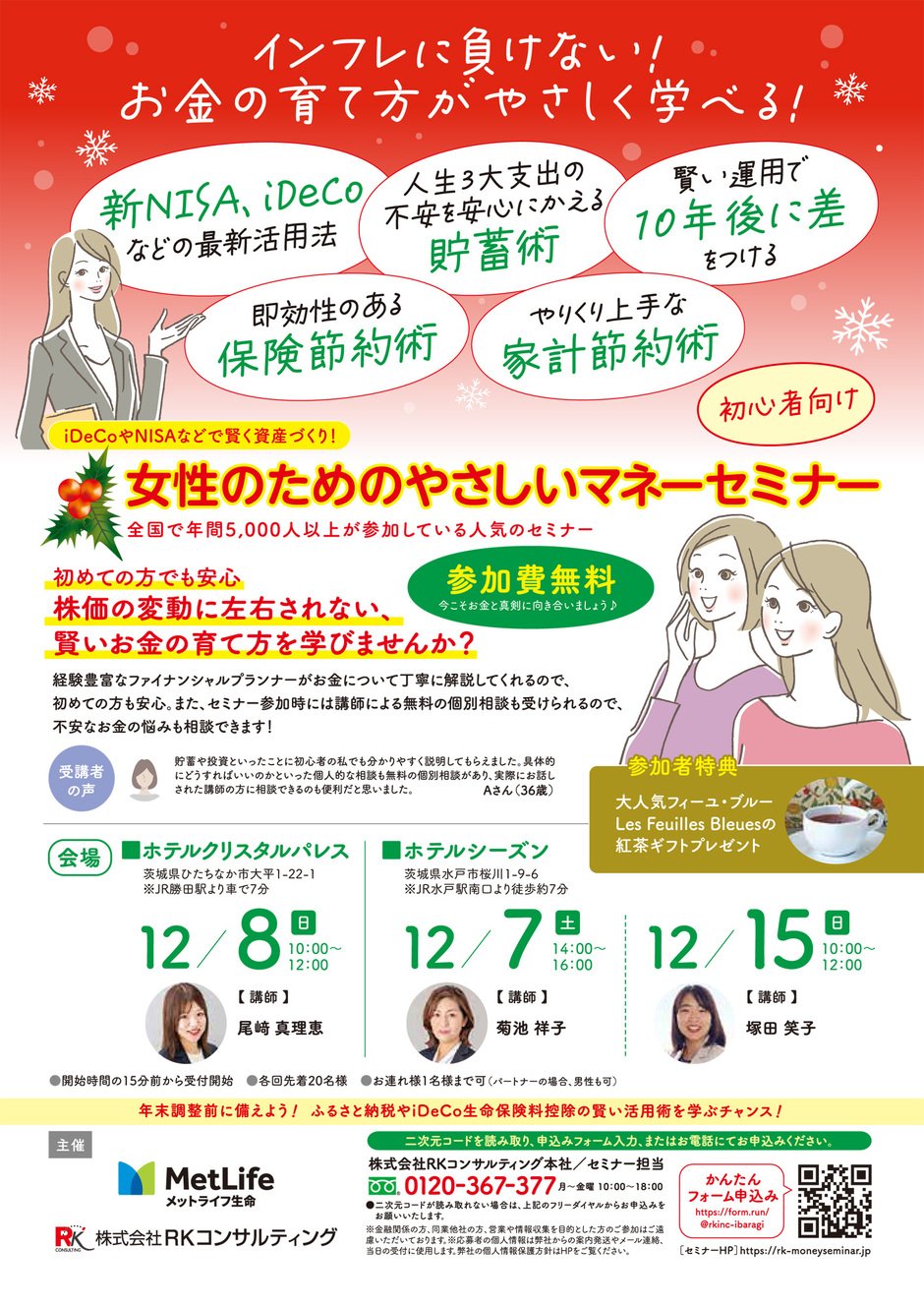 全国で年間5000人以上が参加している人気のマネーセミナーが、12月に水戸市とひたちなか市で開催されます。