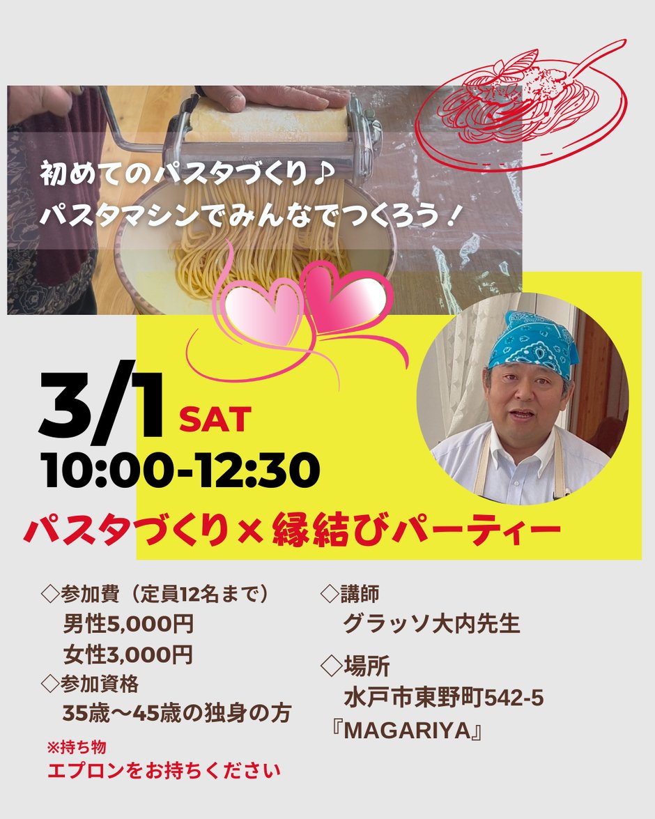 【予約受付中】パスタづくり×縁結びパーティー♪のご案内