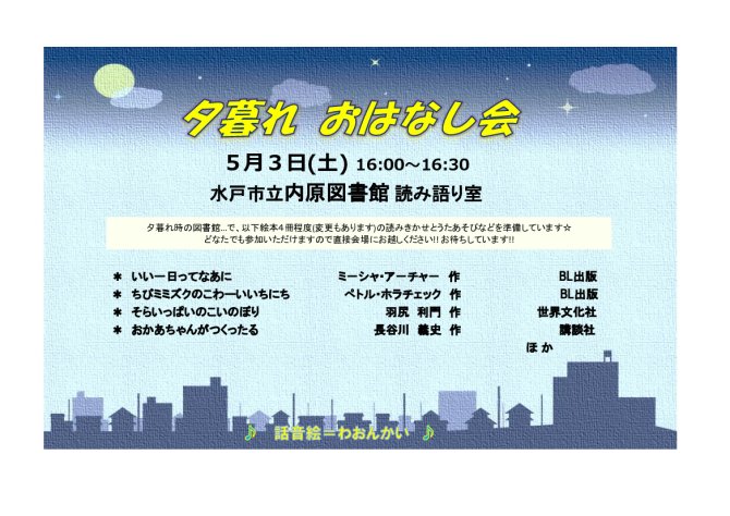 | お問い合わせ | 主催:話音絵=わおんかい (090-7737-8385 久野) 共催:水戸市立内原図書館 (029-291-6451) |