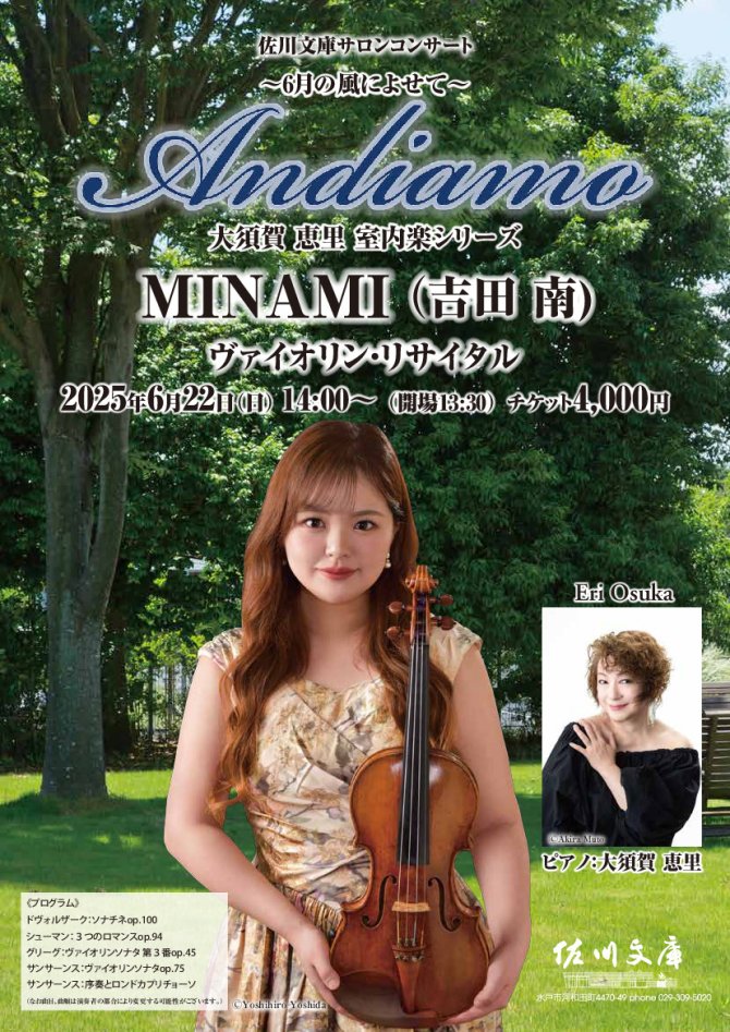 Andiamo ~6月の風によせて~ MINAMI(吉田南)ヴァイオリン・リサイタル ピアノ:大須賀恵里 【プログラム】 ドヴォルザーク:ソナチネ op.100 シューマン:3つのロマンス op.94 グリーグ:ヴァイオリンソナタ 第3番 op.45 サンサーンス:ヴァイオリンソナタ op.75 サンサーンス:序奏とロンドカプリチョーソ