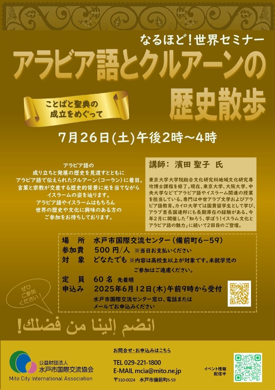 アラビア語の成り立ちと発展の歴史を見渡すとともに、アラビア語で伝えられたクルアーン(コーラン)に着目。アラビア語やイスラームはもちろん、世界の歴史や文化に興味のある方のご参加をお待ちしております。講師は、今年2月の「知ろう、学ぼう!イスラム文化とアラビア語の魅力」に続いて2回目の登壇です。
