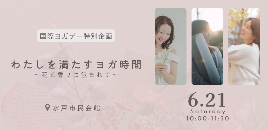国際ヨガデー特別イベント わたしを満たすヨガ時間 〜花と香りに包まれて〜 日々、誰かのためにがんばっているあなたへ。 この90分は「わたし自身」とやさしくつながる時間です。 静かな呼吸に耳を澄ませ、 ふれる感覚、香る空気、流れる音に意識を向ける—— 五感をひらいて、内側から“わたし”を満たしていくヨガをお届けします。 会場にはアロマの香りも漂い、感覚が心地よくひらいていく空間づくりを。 当日は、心と身体の声を聞くジャーナリングタイムからスタート。 やさしい動きが中心なので、ヨガがはじめての方も安心してご参加いただけます。 【日時】 2025年6月21日(土) 10:00〜11:30(受付開始 9:30) 【会場】 〒310-0026 茨城県水戸市泉町1丁目7−1 水戸市民会館 2階 展示室 【ヨガ講師】 戸澤舞 SEIRA 木曽夏希 【定員】 30名(先着順) 【参加費】 一般:2,500円 中高生:1,000円 小学生以下:無料 (※当日現金払い) 親子でのご参加も大歓迎です! 【持ち物】 ・動きやすい服装(自分の気分が上がるウェアがおすすめ) ・水分 ・タオル ・ヨガマットはこちらでご用意しますが、ご自身のマットでもOKです。