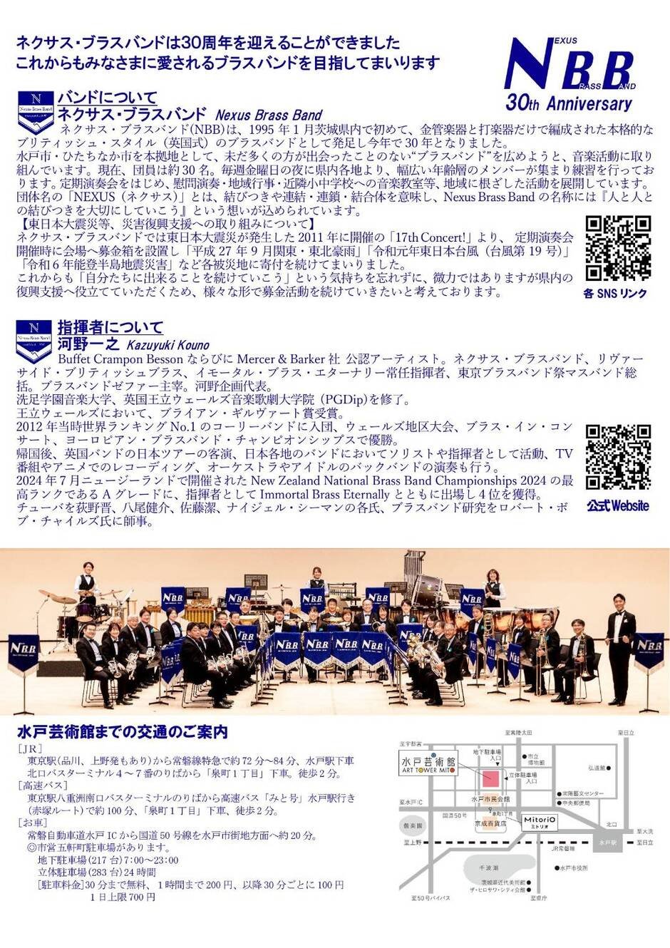 茨城県水戸市・ひたちなか市を中心に活動しているネクサス・ブラスバンドです。 英国式ブラスバンド(金管バンド)を楽しみ、その素晴らしさを広めようと音楽活動に取り組んでおります。 この度「30th Anniversary Concert!」を開催します。今年で発足から30年となる記念のコンサートでは、30周年記念委嘱作品を披露します。 30年間の感謝の気持ちと、ブラスバンドの魅力と楽しさを感じていただける演奏会です。 是非ご来場ください。 曲目: ネクサス / フィリップ・ハーパー作曲(30周年記念委嘱作品) ハーモニー・ミュージック / フィリップ・スパーク作曲 ウエスト・サイド・ストーリーより組曲 / バーン・スタイン作曲 ライオン・キング / ハンス・ジマー作曲 他 指揮:河野一之(ネクサス・ブラスバンド常任指揮者) チケット取扱い: 水戸芸術館 ・エントランスホール内チケットカウンター ・水戸芸術館チケット予約センター ・ウェブ予約 https://www.arttowermito.or.jp/ticket/ かわまた楽器店 ヤマハミュージックジャパン水戸店 永江楽器水戸