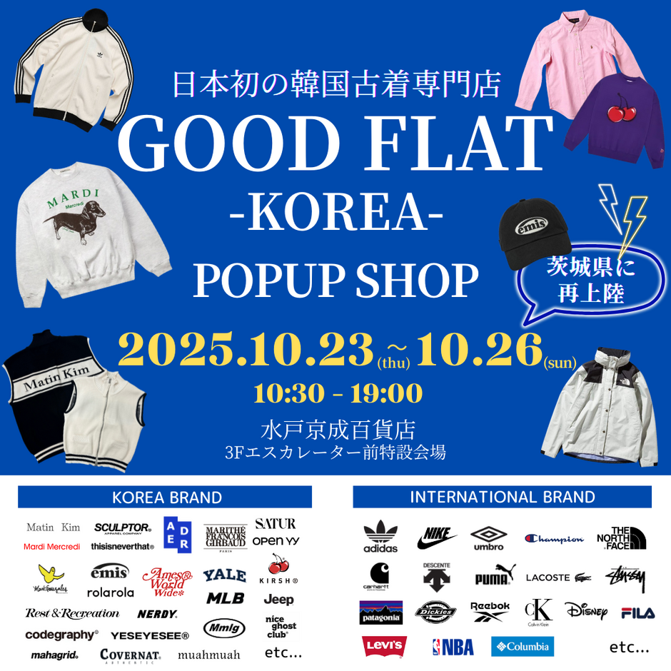韓国現地でしか手に入らないレアブランドから、日本ではまだ流通の少ない注目ブランドまで── 日本の最新ファッショントレンドと掛け合わせた、日本初の韓国古着専門店、『GOODFLAT-KOREA-』 が、水戸京成百貨店に期間限定で登場! 1会場あたり3,000点以上の豊富なアイテム数を誇り、開催期間中はユニセックスアイテムを中心に新作商品を随時追加。 性別・世代問わず、訪れるたびに新しい出会いが楽しめる空間をご提供します。 ≪POPUP開催概要≫ 開催場所:水戸京成百貨店 3Fエスカレーター前特設会場 開催日時:2025年10月23日(木)~10月26日(日) 10:30-19:00 アクセス:茨城県水戸市泉町1-6-1 お車の場合:水戸南ICから車で15分 提携駐車場 駐車場台数721台 電車の場合:JR水戸駅下車 北口よりタクシー約5分 北口4番・5番バス停より「泉1丁目」下車 【ONLINE STORE】 https://goodflat.net/ 【Instagram】 https://www.instagram.com/goodflat_korea/ 【TikTok】 https://www.tiktok.com/@goodflat.kr 【X】 https://x.com/goodflat_korea 【HP】 https://anewinc.co.jp/