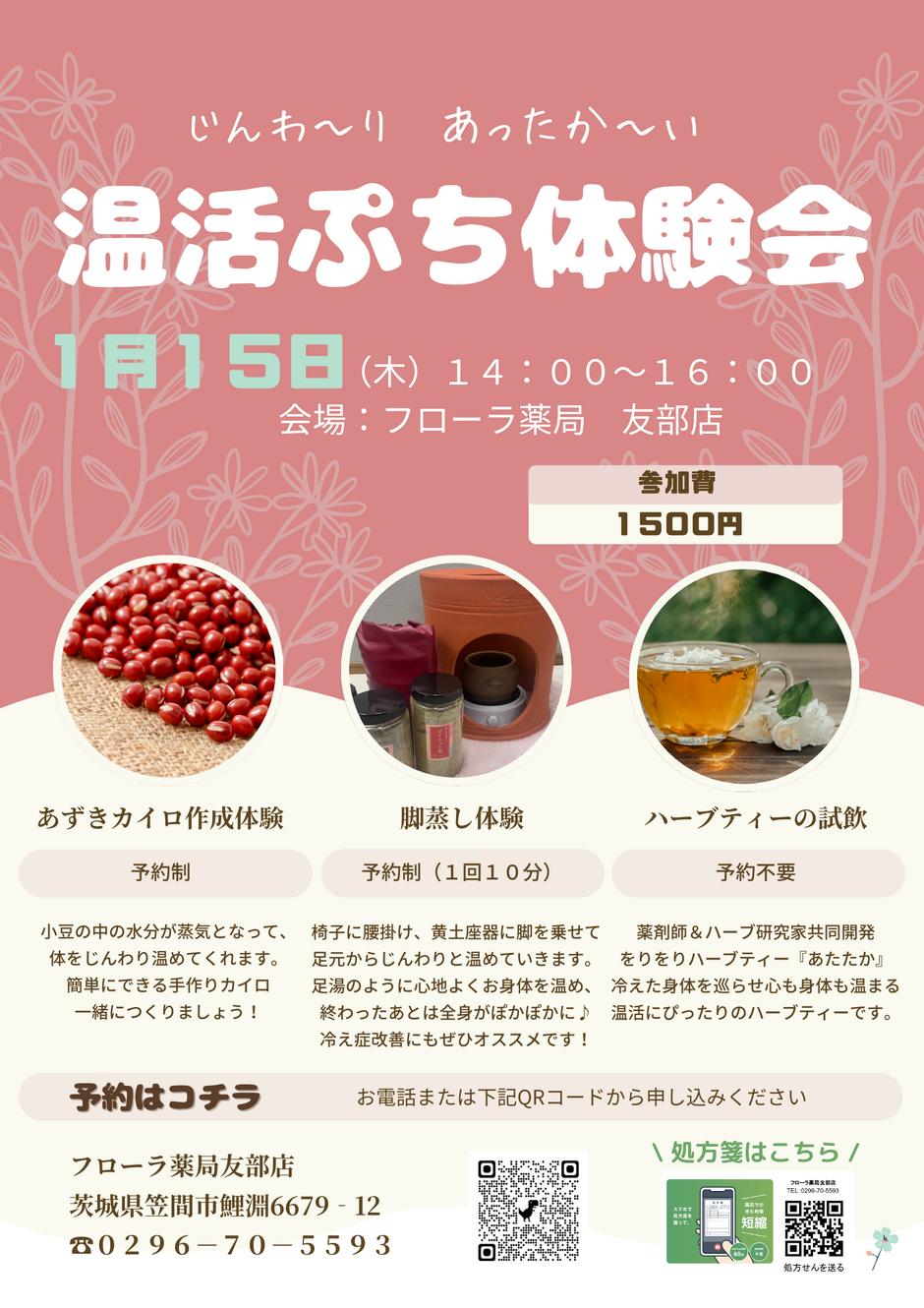 寒さが本格的になってくるこの季節、皆さまいかがお過ごしでしょうか。 フローラ薬局友部店では、気軽に“温活”を楽しんでいただける 「温活ぷち体験会」 を開催いたします。 当日は、 ・あずきカイロの作成体験 ・よもぎ蒸し(脚部位)体験 ・オリジナルハーブティー『あたたか』の試飲 など、心も身体もほっと温まる貴重な体験をご用意しております。 冷えが気になる方、リラックスしたい方にぴったりの内容です。 ぜひお気軽にお立ち寄りください♪