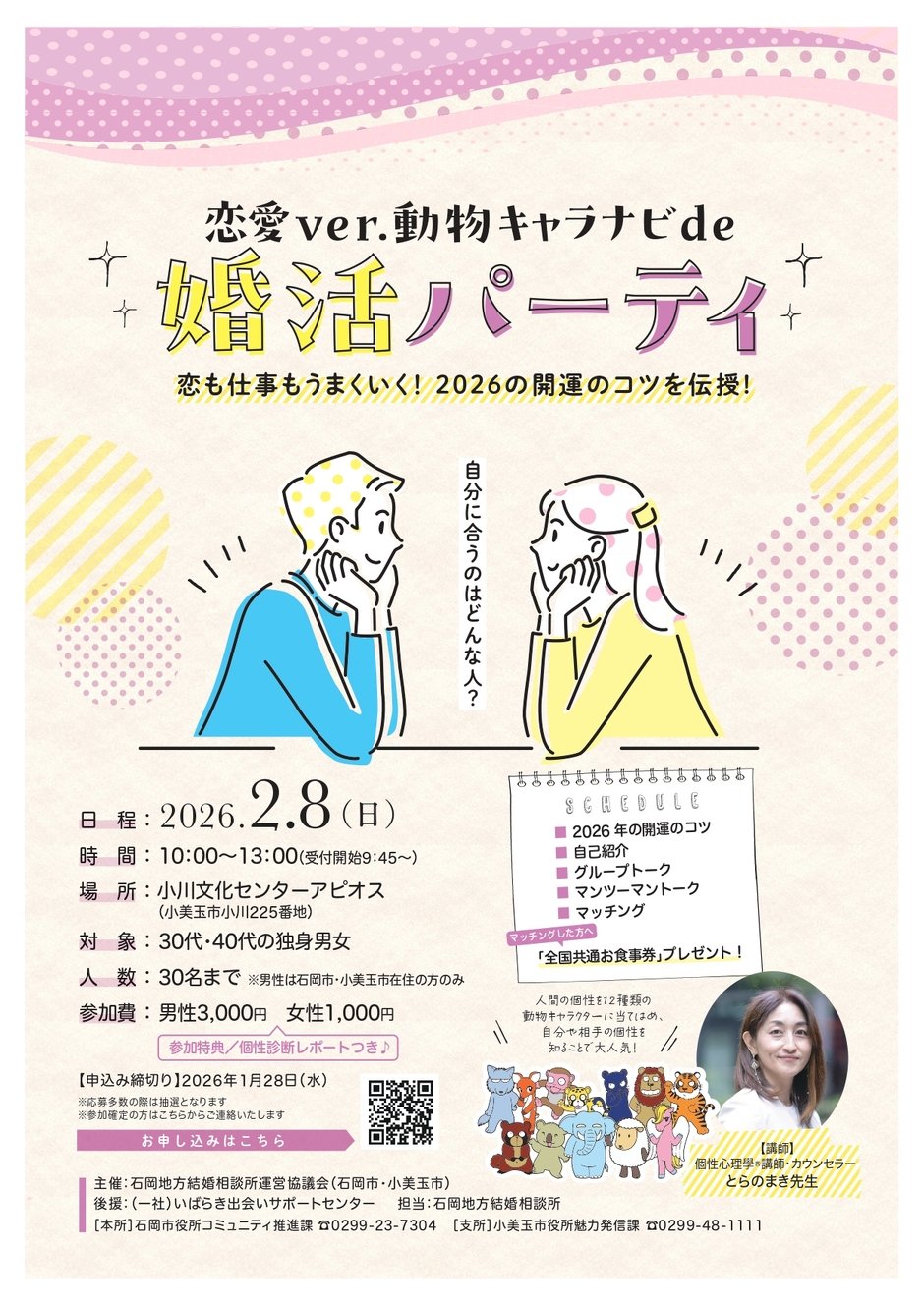 定員:30名(30代・40代の独身男女) ※男性は石岡市又は小美玉市在住の独身男性のみ ※多数のお申込みは抽選となります ※参加確定の方にご連絡をいたします |