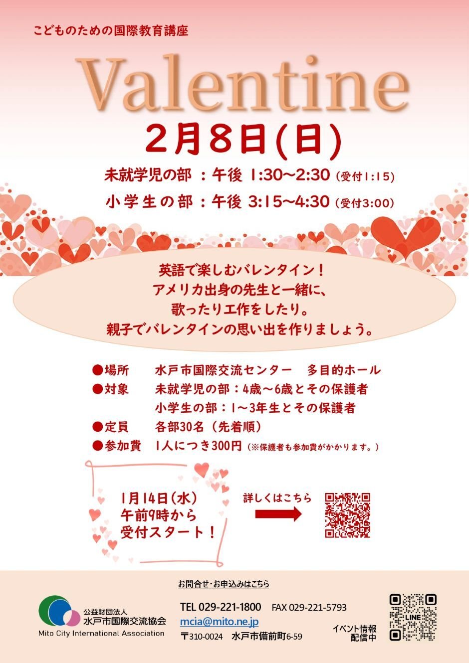 ●英語で楽しむバレンタイン!アメリカ出身の先生と一緒に、歌ったり工作をしたり。親子でバレンタインの思い出を作りましょう。●受付は1月14日午前9時スタート●当協会ホームページから、専用の申込みフォームで。
