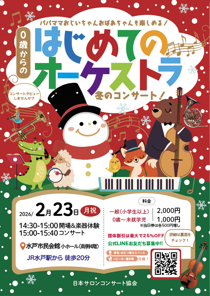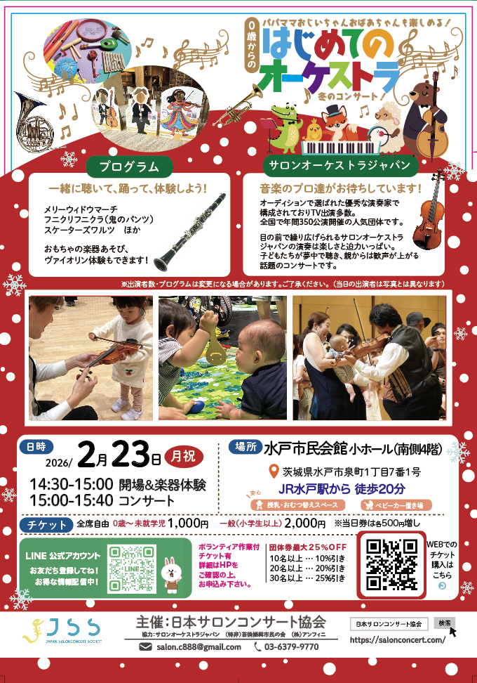 0歳の赤ちゃんから参加できる、全国で大人気の参加体験型クラシックコンサートです。 開演前には音のでるおもちゃの楽器や、本物のヴァイオリンに触れられる楽器体験コーナーも!コンサートでは楽器のすぐ近くで聴いたり、手拍子で共演したり、ママと一緒に踊ったり..初めての音楽との出会いに最適なコンサートです。 【冬プログラム】ワルツで踊ろう!のコーナーはスケーターズワルツ、鬼のパンツ(フニクリフニクラ)、メリーウィドウマーチ、ほか。冬気分を盛り上げる名曲を次々演奏! おもちゃの楽器あそび・ヴァイオリン体験もできます! チケットは公式ホームページからご購入いただけます https://wp.me/p84ZEn-2FS