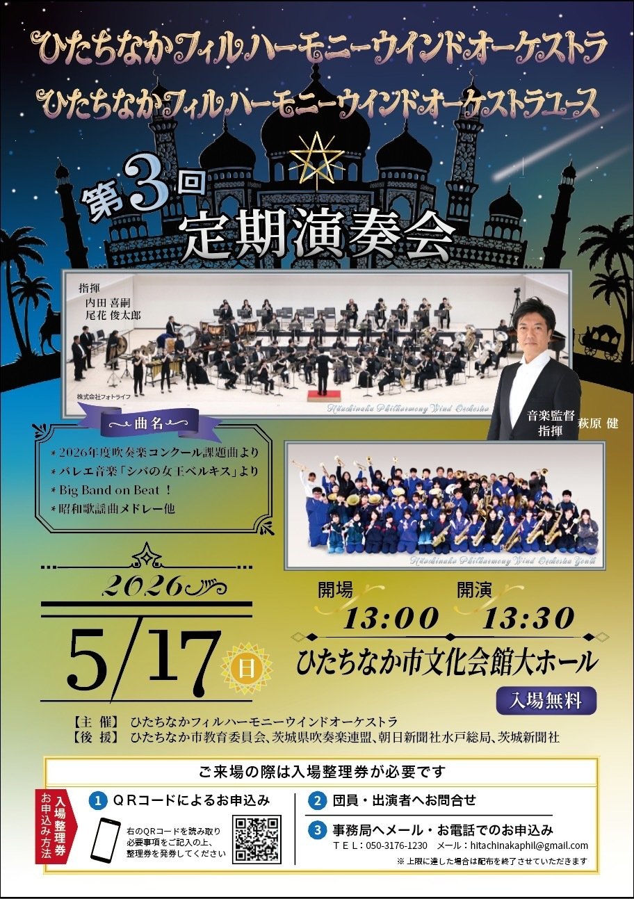 ひたちなか市を中心に活動している吹奏楽団です。 今回の演奏会では、ひたちなか市内の中学生で活動している、ひたちなかフィルハーモニーウインドオーケストラユースも演奏いたします。 ぜひお楽しみに! みなさんに楽しんでいただけるプログラムをご用意して、団員一同心よりお待ちしています! 入場整理券はQRコードからのお申し込み、団員または事務局へお問い合わせください。
