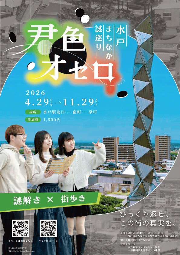 実際に水戸の街を歩きながら謎を解く体験型ゲーム・イベントです 物語 『ひっくり返せ、この街の真実を。』 水戸のまちなかを歩いていたあなたは、「トイロ」と名乗る大学生とLINEでつながる。 彼女は色を失った世界、「オセロ・ワールド」に迷い込んでいた。 「お願い、私をこの世界から連れ出して。」 あなたは、水戸のまちなかに隠された謎を解き、トイロの運命をひっくり返すことができるのか?